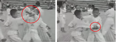 Mabuni's books are particularly important because they explain that you only face one opponent in forms, the meaning of angles, etc. But how do we know early taekwondoin read these books? Because self-defense sets from these books are encoded into the forms! Take the following bear hug defense from Mabuni's Karate-Do Nyumon, which is found in the KTA poomsae Sipjin.